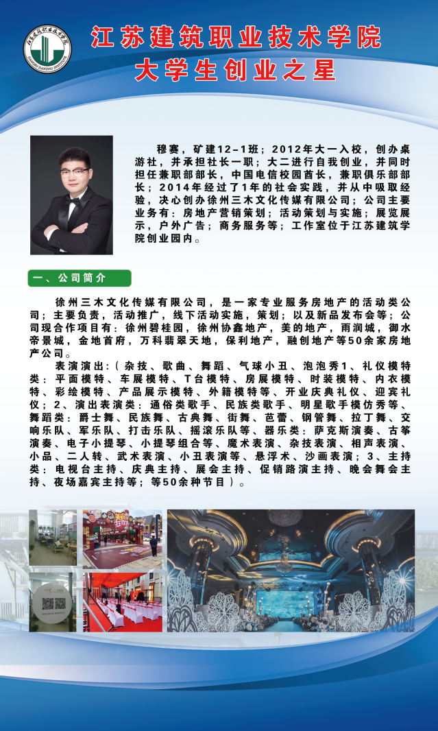 穆赛,矿建12-1班;2012年大一入校,创办桌游社,并承担社长一职;大二进行自我创业,并同时担任兼职部部长,中国电信校园酋长,兼职俱乐部部长;2014年经过了1年的社会实践,并从中吸取经验,决心创办徐州三木文化传媒有限公司;公司主要业务有:房地产营销策划;活动策划与实施;展览展示,户外广告;商务服务等;工作室位于江苏建筑公司创业园内。